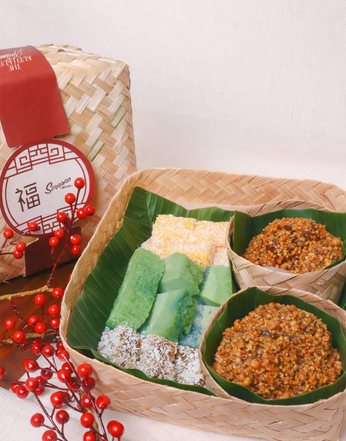 Savor the soft, glutinous Muahchee, the sweet, layered delight of Sarlat, the smooth, comforting Steamed Tapioca, and the subtly fragrant Kueh Kosui. This set is a golden celebration on your plate, ideal for intimate celebrations and meaningful reunions